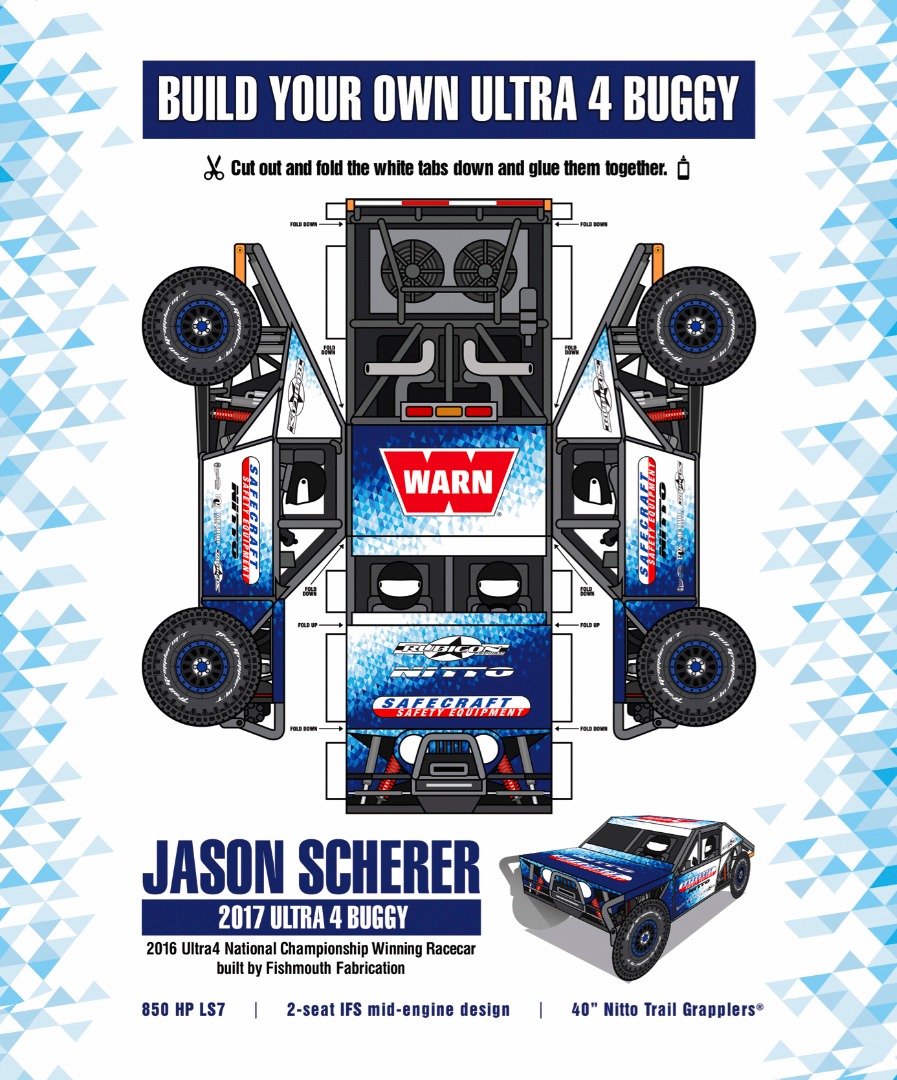 While racing is serious business, Ultra4 fans love to have fun with it too! So why not build your own paper car version of Jason Scherer's version 2.0 of the Gavel? Switching things up to accommodate for two seats in his buggy, Jason Scherer's old co-driver Jason Berger will be joining him to navigate through the challenges of the toughest race on earth. Read all about the v2.0 build here then print out the image above to papercraft your way to a buggy of your own.